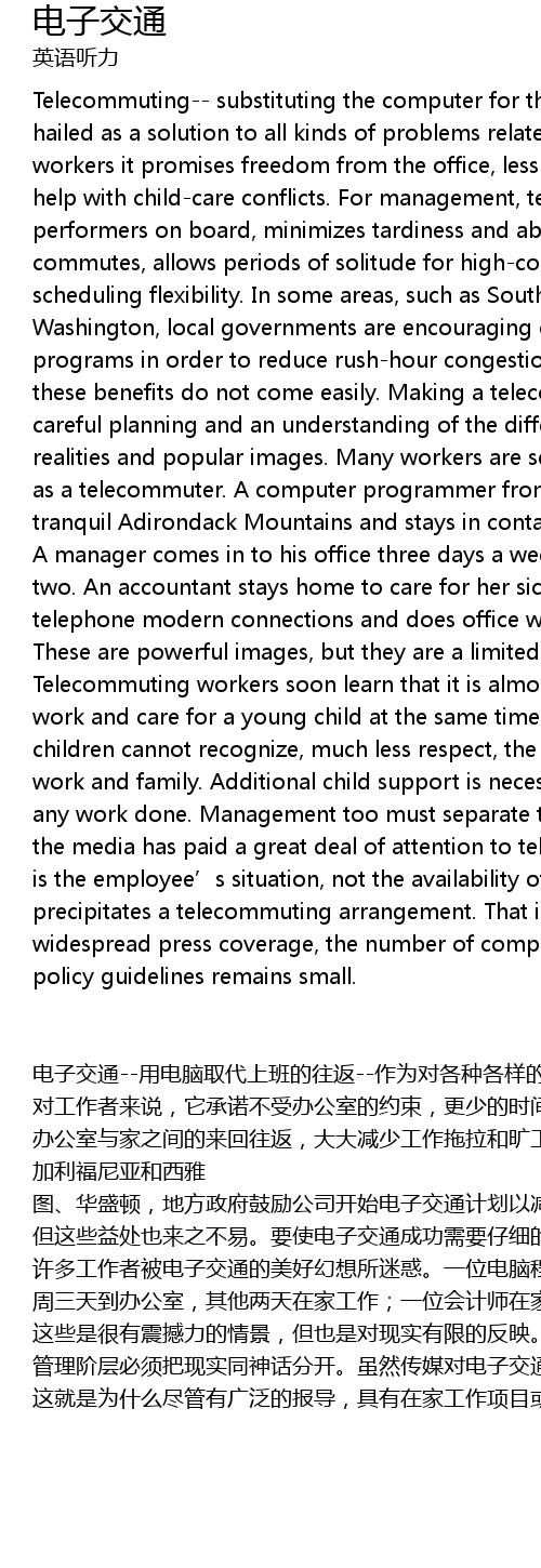 | 电子交通--用电脑取代上班的往返--作为对各种各样的办公室工作问题的解决办法已受到了欢迎。 对工作者来说,它承诺不受办公室的约束,更少的时间浪费在交通上和有助于解决照看小孩的矛盾。对管理者来说,电子交通有助于挽留高效率的工作者,通过省去 办公室与家之间的来回往返,大大减少工作拖拉和旷工,给予管理者独处的时间来完成需要高度集中精神的任务,为管理者提供灵活的时间安排。在一些地区,如南 加利福尼亚和西雅 图、华盛顿,地方政府鼓励公司开始电子交通计划以减少交通高峰时的塞车和提高空气质量。 但这些益处也来之不易。要使电子交通成功需要仔细的计划并且理解电子交通的现实状况和流行的想象之间的区别。 许多工作者被电子交通的美好幻想所迷惑。一位电脑程序设计员从纽约市搬到了宁静的阿第伦达克山,用电脑保持与她办公室之间的联系。一位经理一 周三天到办公室,其他两天在家工作;一位会计师在家照顾她生病的孩子,接通电话调制解调器的接头,在同医生通话之余完成办公室工作。 这些是很有震撼力的情景,但也是对现实有限的反映。电子交通者很快发现在同一时间专注工作和照看小孩几乎是不可能的。在某个年龄之前,小孩子不可能意识到,更不可能尊重工作与家庭之间的界限。如果家长要完成工作,就必须另外照看小孩。 管理阶层必须把现实同神话分开。虽然传媒对电子交通投入了极大的关注,但在很大程度上,是员工的实际情况而不是技术的可能性促成电子交通的安排。 这就是为什么尽管有广泛的报导,具有在家工作项目或行动纲领的公司数目依然很少的部分原因。 |
