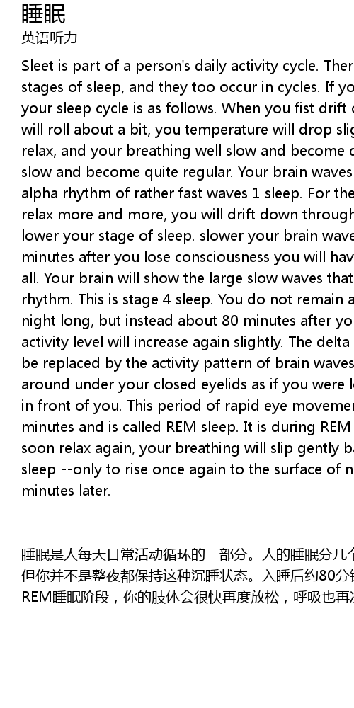 | shuì mián shì rén měi tiān rì cháng huó dòng xún huán de yī bù fen. rén de shuì mián fēn jǐ gè jiē duàn, ér zhèi xiē jiē duàn yě shì xún huán fā shēng de. rú guǒ nǐ shì yí gè zhèng cháng de shuì mián zhě, nǐ de shuì mián xún huán huì zhè yàng jìn xíng. zài nǐ kāi shǐ hūn hūn rù shuì shí, nǐ de yǎn jīng huì gǔn dòng jǐ xià, tǐ wēn lüè yǒu xià jiàng, jī ròu fàng sōng, hū xī biàn de huǎn màn ér yǒu jié zòu. chú le kāi shǐ jǐ fēn zhōng bǐ jiào kuài de jié zòu wài, nǎo diàn bō yě shāo yǒu jiǎn huǎn. zhè bèi chēng wéi dì yī jiē duàn shuì mián. zài suí hòu yuē bàn xiǎo shí nèi, nǐ jìn yī bù fàng sōng, jìn rù dì èr hé dì sān jiē duàn shuì mián. shuì mián yuè shēn rù, nǎo diàn bō jiù yuè huǎn màn. dà yuē zài kāi shǐ shuì mián hòu de 40 dào 60 fēn zhōng, nǐ jiāng jìn rù chén shuì zhuàng tài. zhè shí de nǎo diàn bō biǎo xiàn wèi jù dà de huǎn bō, bèi chēng wéi jié zòu. zhè jiù shì dì sì jiē duàn shuì mián. dàn nǐ bìng bú shì zhěng yè dōu bǎo chí zhè zhǒng chén shuì zhuàng tài. rù shuì hòu yuē 80 fēn zhōng zuǒ yòu, nǐ de dà nǎo yùn dòng shuǐ píng huì zài dù lüè yǒu tí gāo. jié zòu xiāo shī, bìng bèi nǎo diàn bō de yùn dòng tú xíng qǔ dài. nǐ de yǎn jīng huì zài bì zhe de yǎn jiǎn xià xùn sù zhuàn dòng, jiù hǎo xiàng nǐ zài kàn zhuó yǎn qián fā shēng de shén me shì qíng. zhè zhǒng xùn sù de yǎn qiú yùn dòng chí xù yuē 8 15 fēn zhōng, zhè yī jiē duàn shuì mián bèi chēng zhī wéi kuài sù yǎn dòng REM shuì mián. zài REM shuì mián jiē duàn, nǐ de zhī tǐ huì hěn kuài zài dù fàng sōng, hū xī yě zài cì fàng màn bìng biàn de yǒu jié zòu, nǐ huì qīng sōng dì cóng dì yī jiē duàn huá rù dì sì jiē duàn shuì mián zhí dào dà yuē 80 fēn zhōng hòu chóng xīn jiē jìn qīng xǐng zhuàng tài. |