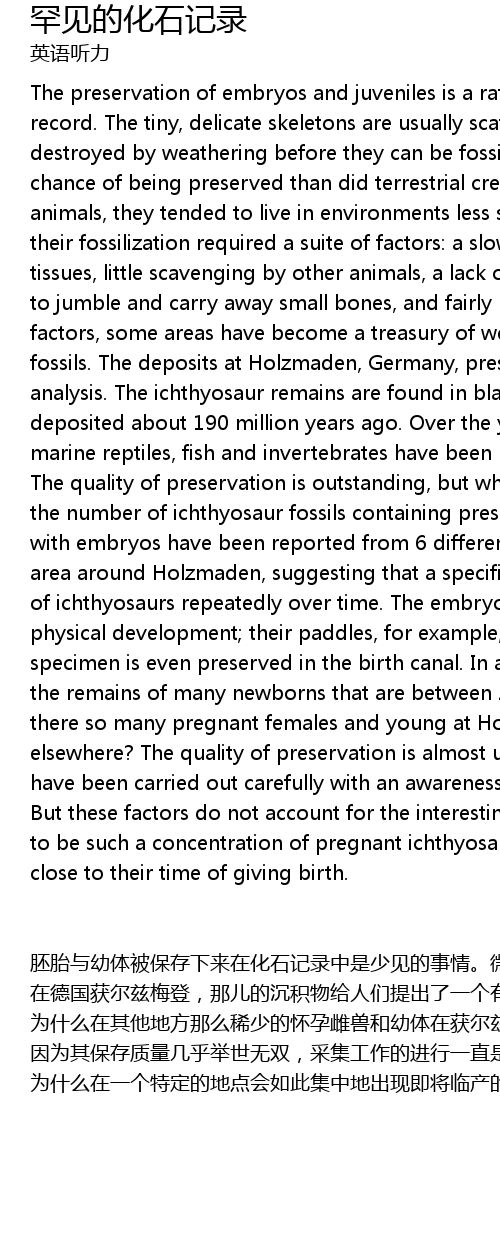 | pēi tāi yǔ yòu tǐ bèi bǎo cún xià lái zài huà shí jì lù zhōng shì shǎo jiàn de shì qíng. wēi xiǎo xiān xì de gǔ gé tōng cháng zài shí huà qián jiù bèi shí fǔ ròu de dòng wù chāi sàn le, huò zhě bèi fēng huà zuò yòng pò huài diào le. yú lóng bǐ qǐ lù dì de dòng wù yǒu gèng dà de jī lǜ bèi bǎo cún xià lái, yīn wèi tā men zuò wéi hǎi yáng dòng wù cháng shēng huó zài fǔ shí xìng jiào xiǎo de huán jìng zhōng. dàn shì tā men de shí huà xū yào yī xì liè yīn sù: ruǎn zǔ zhī de fǔ làn sù dù huǎn màn, hěn shǎo bèi qí tā dòng wù cán shí, quē shǎo hùn zá chōng zǒu xiǎo gú tou de kuài sù shuǐ liú hé bō làng, yǐ jí xiāng dāng kuài dì bèi yǎn mái. dāng zhèi xiē yīn sù cún zài shí, mǒu xiē dì qū jiù huì biàn chéng yí gè chōng mǎn bǎo cún wán hǎo de yú lóng huà shí de bǎo kù. zài dé guó huò ěr zī méi dēng, nà ér de chén jī wù gěi rén men tí chū le yí gè yǒu qù de fēn xī àn lì. rén men zài hēi sè de hán lì qīng de hǎi yáng yè yán zhōng fā xiàn le yuē 19, 000 nián qián chén jī xià lái de yú lóng huà shí. jǐ nián shí jiān nèi, zài zhèi xiē yán shí zhōng qǔ de le shù yǐ qiān jì de hǎi yáng pá xíng dòng wù yú lèi yǐ jí wú jǐ zhuī dòng wù de biāo běn. tā men de bǎo cún zhì liàng fēi cháng de hǎo, dàn gèng lìng rén chēng qí de shì bǎo cún xià lái de yù yǒu pēi tāi de yú lóng huà shí shù mù. zài huò ěr zī méi dēng fù jìn yí gè xiǎo dì qū de liù ge bù tóng de yè yán céng zhōng fēn bié fā xiàn le yù yǒu pēi tāi de yú lóng huà shí. zhè biǎo míng dà liàng de yú lóng jīng nián lěi yuè chóng fù shǐ yòng yí gè tè dìng de dì diǎn. nèi xiē pēi tāi yǐ jīng fā yù dé xiāng dāng wán zhěng le. bǐ rú, tā men de pǔ jiǎng yǐ jīng wán quán xíng chéng le. yǒu yí gè biāo běn shèn zhì bèi bǎo cún zài chǎn dào zhōng. ér qiě, nà kuài yè yán bāo hán zhe hěn duō zài 20 dào 30 yīng cùn zhī jiān de xīn shēng yòu tǐ de huà shí. wèi shí me zài qí tā dì fāng nà me xī shǎo de huái yùn cí shòu hé yòu tǐ zài huò ěr zī méi dēng què nà me duō ne? yīn wèi qí bǎo cún zhì liàng jī hū jǔ shì wú shuāng, cǎi jí gōng zuò de jìn xíng yī zhí shì yī sī bù gǒu de. dà jiā dōu rèn shi dào zhèi xiē huà shí de jià zhí jí qí zhēn guì, dàn zhèi xiē yīn sù bìng bù néng jiě shì zhè gè yǒu qù de wèn tí: wèi shí me zài yí gè tè dìng de dì diǎn huì rú cǐ jí zhōng dì chū xiàn jí jiāng lín chǎn de huái yùn yú lóng qún ne? |
