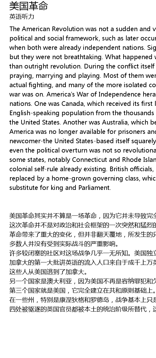 | měi guó gé mìng qí shí bìng bù suàn shì yī chǎng gé mìng, yīn wèi tā bìng wèi dǎo zhì wán quán de hé chè dǐ de biàn huà. zhè cì gé mìng bìng bú shì duì zhèng zhì hé shè huì kuàng jià de yī cì tū rán hé měng liè de diān fù, xiàng hòu lái zài yǐ jīng shì dú lì guó jiā de fǎ guó hé é guó suǒ bào fā de gé mìng nà yàng. gé mìng dài lái le zhòng dà de biàn huà, dàn bìng fēi fān tiān fù dì, suǒ fā shēng de zhǐ shì jìn huà de jiā sù, ér bú shì yī chǎng chè dǐ de gé mìng zài chōng tū qī jiān, rén men réng rán shàng bān zuò lǐ bài jié hūn wán shuǎ. duō shù rén bìng méi yǒu shòu dào shí jì zhàn dòu de yán chóng yǐng xiǎng. xǔ duō jiào bì sè de shè qū duì zhè chǎng zhàn zhēng jī hū yī wú suǒ zhī. měi guó dú lì zhàn zhēng xuān bù le sān ge xiàn dài guó jiā de dàn shēng, qí zhōng yí gè shì jiā ná dà. jiā ná dà de dì yī dà pī jiǎng yīng yǔ de liú rù rén kǒu lái zì yú chéng qiān shàng wàn yīng wáng de xiào zhōng zhě, zhèi xiē rén cóng měi guó táo dào le jiā ná dà. lìng yí gè guó jiā shì ào dà lì yà, yīn wèi měi guó bù zài shì róng nà zuì fàn hé qiàn zhài zhě de guó dù le, ào dà lì yà jiù biàn chéng le yí gè chéng zhì zuì fàn de zhí mín dì zhù: dú lì zhàn zhēng qián, yīng guó zhèng fǔ jiāng zuì fàn liú fàng dào měi guó. dì sān ge guó jiā jiù shì měi guó, tā wán quán jiàn lì zài gòng hé yuán zé jī chǔ shàng. jí shǐ zhèng zhì shàng de diān fù yě bù rú rén men kě néng xiǎng xiàng de nà yàng jù yǒu gé mìng xìng. zài yī xiē zhōu, tè bié shì kāng niè dí gé hé luó dé dǎo, zhàn zhēng jī běn shàng zhǐ shì chéng rèn le yǐ jīng cún zài de zhí mín dì de zì zhì. sì chù bèi qū zhú de yīng guó guān yuán dōu bèi běn tǔ de tǒng zhì jiē jí suǒ tì dài, zhè gè tǒng zhì jiē jí xùn sù dì yǐ dì fāng quán lì jī guān lái tì dài guó wáng hé yì huì. |