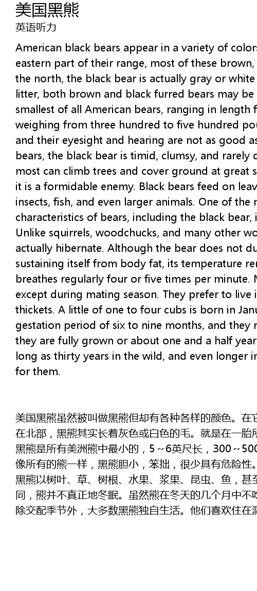 | měi guó hēi xióng suī rán bèi jiào zuò hēi xióng dàn què yǒu gè zhǒng gè yàng de yán sè. zài tā men shēng huó qū yù de dōng bù, dà bù fèn hēi xióng zhǎng yǒu fù yǒu guāng zé de hēi máo, dàn zài xī bù, tā men zé zhǎng zhe zōng sè hóng sè shèn zhì shì huáng sè de máo. zài běi bù, hēi xióng qí shí zhǎng zhe huī sè huò bái sè de máo. jiù shì zài yī tāi suǒ shēng de xiǎo xióng zhōng, dōu kě néng hùn zá zōng máo hé hēi máo. hēi xióng shì suǒ yǒu měi zhōu xióng zhōng zuì xiǎo de, 5 6 yīng chǐ zhǎng, 300 500 bàng zhòng. tā men de yǎn jīng hé ěr duǒ dōu hěn xiǎo, tā men de shì lì hé tīng jué bù rú xiù jué nà yàng hǎo. xiàng suǒ yǒu de xióng yí yàng, hēi xióng dǎn xiǎo, bèn zhuō, hěn shǎo jù yǒu wēi xiǎn xìng. dàn rú guǒ shòu dào gōng jī, dà bù fèn hēi xióng huì yǐ hěn kuài de sù dù pá shàng shù hé bēn pǎo. dāng fā nù huò shòu jīng xià shí, hēi xióng huì chéng wéi kě pà de duì shǒu. hēi xióng yǐ shù yè cǎo shù gēn shuǐ guǒ jiāng guǒ kūn chóng yú, shèn zhì gèng dà de dòng wù wèi shí. xióng lèi, bāo kuò hēi xióng de zuì yǒu qù de yí gè tè diǎn shì tā men de dōng mián. yǔ sōng shǔ hàn tǎ hé qí tā bié de lín dì dòng wù bù tóng, xióng bìng bù zhēn zhèng dì dōng mián. suī rán xióng zài dōng tiān de jǐ gè yuè zhōng bù chī dōng xī, kào tǐ nèi zhī fáng wéi chí shēng mìng, dàn tā men de tǐ wēn bǎo chí zhèng cháng, bìng yǒu guī lǜ dì yī fēn zhōng hū xī 4 huò 5 cì. chú jiāo pèi jì jié wài, dà duō shù hēi xióng dú zì shēng huó. tā men xǐ huān zhù zài dòng lǐ kōng xīn de dà mù tou lǐ huò mào mì de shù cóng lǐ. jīng guò 6 dào 9 gè yuè de huái yùn qī hòu yī tāi 1 4 gè xiǎo xióng zài 1 yuè huò 2 yuè chū shēng. tā men tóng mǔ xióng zhù zài yì qǐ, zhí dào tā men wán quán cháng dà, jí 1 suì bàn zuǒ yòu. hēi xióng zài yě wài kě yǐ huó dào cháng dá 30 nián, zài zhuān mén de bǎo hù qū zhōng shèn zhì néng huó dé gèng zhǎng. |