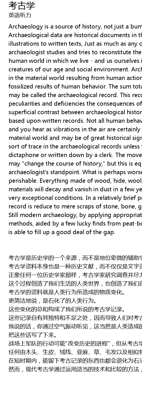 | kǎo gǔ xué shì lì shǐ xué de yí gè lái yuán, ér bú shì dì wèi bēi wēi de fǔ zhù xué kē. kǎo gǔ xué zī liào běn shēn yě shì yī zhǒng lì shǐ wén xiàn, ér bù jǐn jǐn shì wén zì zī liào de lì zhèng. zhèng xiàng rèn hé yī wèi lì shǐ xué jiā nà yàng, kǎo gǔ xué jiā yán jiū diào chá bìng jìn lì qù chóng gòu yí gè guò chéng. zhè gè guò chéng chuàng zào le wǒ men shēng huó de rén lèi shì jiè, yě chuàng zào le wǒ men zì shēn, yīn wèi wǒ men dōu shì wǒ men suǒ chǔ de shí dài hé shè huì huán jìng de chǎn wù. kǎo gǔ xué de zī liào jiù shì rén lèi xíng wéi suǒ zào chéng de wù zhì biàn huà. gèng jiǎn jié dì shuō, shì shí huà le de rén lèi xíng wéi. zhèi xiē biàn huà de zǒng hé gòu chéng le wǒ men suǒ shuō de kǎo gǔ xué jì lù. zhèi xiē jì lù zì yǒu qí dú tè hé bù zú zhī chù, yīn ér dǎo zhì rén men duì kǎo gǔ lì shǐ hé gèng shú xī de wén zì jì zǎi lì shǐ jìn xíng xiāng dāng fū qiǎn de duì bǐ. bìng bú shì suǒ yǒu de rén lèi xíng wéi dōu liú xià huà shí. wǒ shuō de huà, nǐ tōng guò kōng qì zhèn dòng tīng jiàn, zhè dāng rán shì rén lèi zào chéng de wù zhì biàn huà, yě kě néng yǒu zhòng dà de lì shǐ yì yì, dàn zhèi xiē huà zài kǎo gǔ xué zhōng wèi liú xià sī háo hén jī, chú fēi yǒu rén yòng lù yīn jī lù xià lái huò wén shū bǎ zhèi xiē huà xiě le xià lái. zhàn chǎng shàng jūn duì de xíng dòng kě néng" gǎi biàn lì shǐ de jìn chéng", dàn cóng kǎo gǔ xué de guān diǎn lái kàn, zhè tóng yàng shì nán yǐ bǔ zhuō de kě néng gèng zāo de shì, duō shù yǒu jī wù zhì huì fǔ làn. rèn hé yóu mù tou shēng pí róng xiàn yà má cǎo máo fà yǐ jí xiāng sì wù zhì zuò chéng de dōng xī chú fēi zài yī xiē fēi cháng tè shū de tiáo jiàn xià, jǐ nián huò jǐ gè shì jì yǐ hòu, huì zài chén tǔ zhōng fǔ làn bìng xiāo shī. zài duǎn shí qī nèi, néng liú xià kǎo gǔ jì lù de dōng xī yě dōu huì tuì huà wéi shí tou gú tou bō lí jīn shǔ hé táo qì de suì piàn. rán ér, xiàn dài kǎo gǔ xué tōng guò yùn yòng shì dàng de jì shù hé bǐ jiào de fāng fǎ, zài cóng ní tàn shā mò hé dòng tǔ zhōng suǒ huò dé de yī xiē xìng yùn fā xiàn de fǔ zhù xià, néng gòu tián chōng zhè gè kòng quē de hěn dà bù fèn. |
