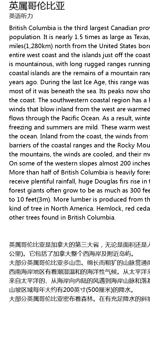 | British Columbia is the third largest Canadian provinces, both in area and population. It is nearly 1.5 times as large as Texas, and extends 800 miles(1,280km) north from the United States border. It includes Canada’s entire west coast and the islands just off the coast. Most of British Columbia is mountainous, with long rugged ranges running north and south. Even the coastal islands are the remains of a mountain range that existed thousands of years ago. During the last Ice Age, this range was scoured by glaciers until most of it was beneath the sea. Its peaks now show as islands scattered along the coast. The southwestern coastal region has a humid mild marine climate. Sea winds that blow inland from the west are warmed by a current of warm water that flows through the Pacific Ocean. As a result, winter temperatures average above freezing and summers are mild. These warm western winds also carry moisture from the ocean. Inland from the coast, the winds from the Pacific meet the mountain barriers of the coastal ranges and the Rocky Mountains. As they rise to cross the mountains, the winds are cooled, and their moisture begins to fall as rain. On some of the western slopes almost 200 inches (500cm) of rain fall each year. More than half of British Columbia is heavily forested. On mountain slopes that receive plentiful rainfall, huge Douglas firs rise in towering columns. These forest giants often grow to be as much as 300 feet(90m) tall, with diameters up to 10 feet(3m). More lumber is produced from these trees than from any other kind of tree in North America. Hemlock, red cedar, and balsam fir are among the other trees found in British Columbia. | |