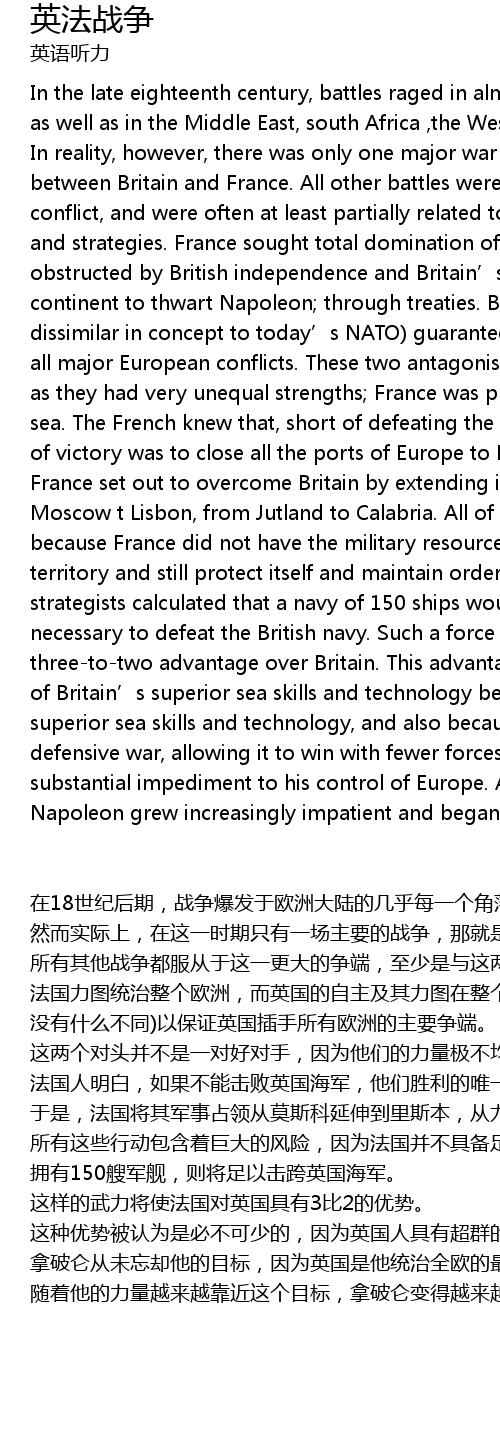 | In the late eighteenth century, battles raged in almost every corner of Europe, as well as in the Middle East, south Africa , the West Indies, and Latin America. In reality, however, there was only one major war during this time, the war between Britain and France. All other battles were ancillary to this larger conflict, and were often at least partially related to its antagonist' goals and strategies. France sought total domination of Europe . this goal was obstructed by British independence and Britain' s efforts throughout the continent to thwart Napoleon through treaties. Britain built coalitions not dissimilar in concept to today' s NATO guaranteeing British participation in all major European conflicts. These two antagonists were poorly matched, insofar as they had very unequal strengths France was predominant on land, Britain at sea. The French knew that, short of defeating the British navy, their only hope of victory was to close all the ports of Europe to British ships. Accordingly, France set out to overcome Britain by extending its military domination from Moscow t Lisbon, from Jutland to Calabria. All of this entailed tremendous risk, because France did not have the military resources to control this much territory and still protect itself and maintain order at home. French strategists calculated that a navy of 150 ships would provide the force necessary to defeat the British navy. Such a force would give France a threetotwo advantage over Britain. This advantage was deemed necessary because of Britain' s superior sea skills and technology because of Britain' s superior sea skills and technology, and also because Britain would be fighting a defensive war, allowing it to win with fewer forces. Napoleon never lost substantial impediment to his control of Europe. As his force neared that goal, Napoleon grew increasingly impatient and began planning an immediate attack. | |