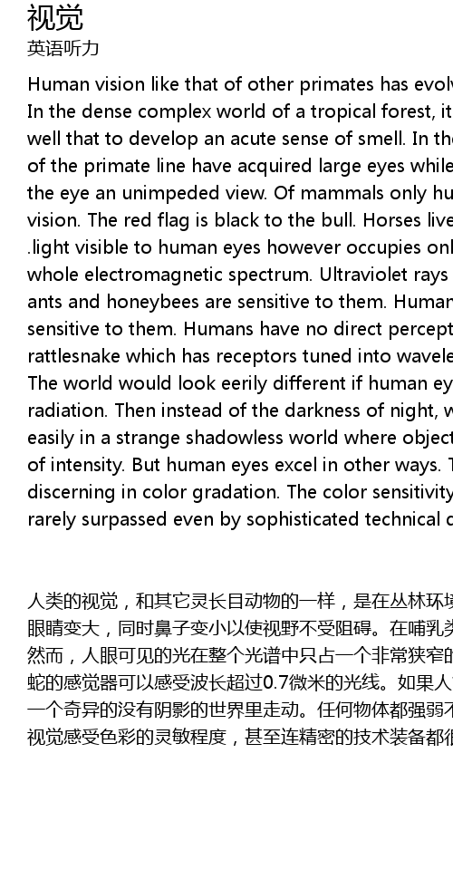 | rén lèi de shì jué, hé qí tā líng zhǎng mù dòng wù de yí yàng, shì zài cóng lín huán jìng zhōng jìn huà chū lái de. zài chóu mì fù zá de rè dài cóng lín lǐ, hǎo de shì jué bǐ líng mǐn de xiù jué gèng jiā zhòng yào. zài jìn huà guò chéng zhōng, líng zhǎng mù dòng wù de yǎn jīng biàn dà, tóng shí bí zi biàn xiǎo yǐ shǐ shì yě bù shòu zǔ ài. zài bǔ rǔ lèi dòng wù zhōng, zhǐ yǒu rén hé yī xiē líng zhǎng mù dòng wù néng gòu fēn biàn yán sè. hóng qí zài gōng niú kàn lái shì hēi sè de, mǎ zé shēng huó zài yí gè dān sè de shì jiè lǐ. rán ér, rén yǎn kě jiàn de guāng zài zhěng gè guāng pǔ zhōng zhǐ zhàn yí gè fēi cháng xiá zhǎi de pín duàn. rén shì kàn bú dào zǐ wài xiàn de, jǐn guǎn mǎ yǐ hé mì fēng kě yǐ gǎn jué dào. yǔ xiǎng wěi shé bù tóng, rén yě bù néng zhí jiē gǎn shòu dào hóng wài xiàn. xiǎng wěi shé de gǎn jué qì kě yǐ gǎn shòu bō cháng chāo guò 0. 7 wēi mǐ de guāng xiàn. rú guǒ rén néng gǎn shòu dào hóng wài xiàn de huà, zhè shì jiè kàn shang qu jiāng shí fēn bù tóng, ér qiě kǒng bù. dào nà shí, jiāng yǔ yè de hēi àn xiāng fǎn, wǒ men néng qīng yì dì zài yí gè qí yì de méi yǒu yīn yǐng de shì jiè lǐ zǒu dòng. rèn hé wù tǐ dōu qiáng ruò bù děng dì shǎn zhe guāng. rán ér, rén yǎn zài qí tā fāng miàn yǒu yōu yuè zhī chù. shì shí shàng, rén yǎn duì yán sè tī dù jù yǒu fēi fán de fēn biàn néng lì. pǔ tōng rén lèi de shì jué gǎn shòu sè cǎi de líng mǐn chéng dù, shèn zhì lián jīng mì de jì shù zhuāng bèi dōu hěn nán chāo yuè. |