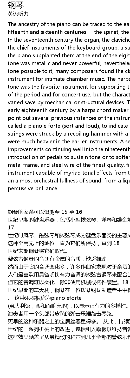 | 钢琴的家系可以追溯至 15 至 16 世纪早期的键盘乐器,包括小型拨弦琴、洋琴和维金娜琴。 17 世纪时风琴、敲弦琴和拨弦琴成为键盘乐器类的主要成员。 这种至高无上的地位一直为它们所保持,直到 18 世纪末期钢琴将它们取代。 敲弦古钢琴的音调有金属的音质,缺乏雄劲。 然而由于它的音调变化多,许多作曲家发现对于亲切的室内乐是一种得体的乐器。 人们最喜欢用具备明快有力音调的拨弦古钢琴来配合当时小型管弦乐团的低音乐器以及在演奏会上演奏。 但它的音调难以变化,除非使用机械或构件装置。18 世纪早期的意大利,钢琴在一位拨琴钢琴制造者手中得到完善(尽管音乐理论家们指出有更早的例子) 。 这种乐器被称为piano eforte (意大利语,柔和而响亮的),以显示它有力的多样性。 演奏者用一个头部带皮毡的弹击乐锤敲击琴弦。 更早的这种乐器之上的金属丝要重得多。 从此,持续到 19 世纪的一系列机械上的改进,包括引入踏板以维持音调或使其柔和,改善金属框架,以及使用最佳性能的钢丝,最终产生了一种具备无数音调效果的乐器。 这些效果涵盖了从最精致的和声到几乎全部的管弦乐音响,从明快流畅的吟唱的音调到尖锐的打击乐器的清晰动人的恢宏气势。 |