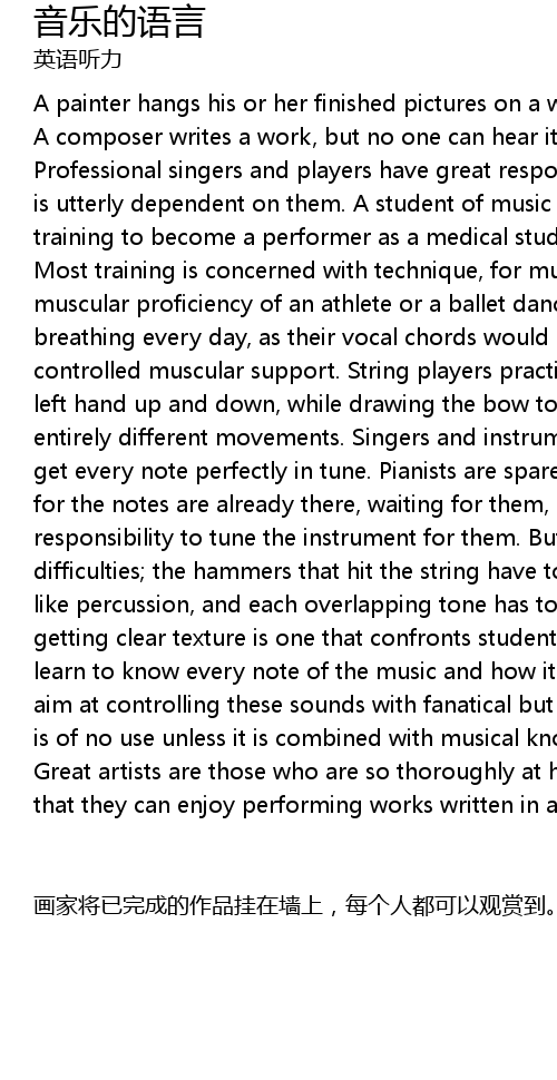 | A painter hangs his or her finished pictures on a wall, and everyone can see it. A composer writes a work, but no one can hear it until it is performed. Professional singers and players have great responsibilities, for the composer is utterly dependent on them. A student of music needs as long and as arduous a training to become a performer as a medical student needs to become a doctor. Most training is concerned with technique, for musicians have to have the muscular proficiency of an athlete or a ballet dancer. Singers practice breathing every day, as their vocal chords would be inadequate without controlled muscular support. String players practice moving the fingers of the left hand up and down, while drawing the bow to and fro with the right arm two entirely different movements. Singers and instrumentalists have to be able to get every note perfectly in tune. Pianists are spared this particular anxiety, for the notes are already there, waiting for them, and it is the piano tuner' s responsibility to tune the instrument for them. But they have their own difficulties the hammers that hit the string have to be coaxed not to sound like percussion, and each overlapping tone has to sound clear. This problem of getting clear texture is one that confronts student conductors: they have to learn to know every note of the music and how it should sound, and they have to aim at controlling these sounds with fanatical but selfless authority. Technique is of no use unless it is combined with musical knowledge and understanding. Great artists are those who are so thoroughly at home in the language of music that they can enjoy performing works written in any century. | |