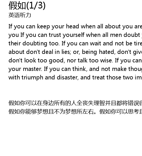 | 假如你可以在身边所有的人全丧失理智并且都将错误归咎于你之时仍保持冷静。假如你可以在所有人怀疑你之时依旧坚持自我并且仍然欣然接受他人的质疑。假如你可以等候且不因此而疲惫;不以谎言来对付谎言;不以恶报恶;不过分注重打扮也不时常说些显得自己高明智慧的话语。 假如你能够梦想且不为梦想所左右。假如你可以思考且不为思考所摆布。假如你能够对胜利和失败一视同仁。 |