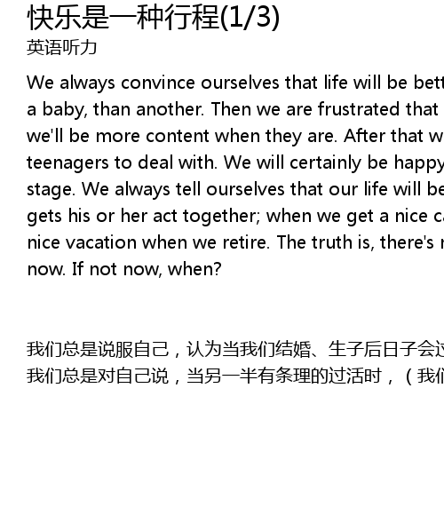 | wǒ men zǒng shì shuō fú zì jǐ, rèn wéi dāng wǒ men jié hūn shēng zǐ hòu rì zi huì guò de gèng jiā shū xīn xiē. rán hòu wǒ men yòu bèi nèi xiē xiǎo guǐ de bù dǒng shì gǎo dé bù shùn xīn, dāng tā men dà le xiē hòu, qíng kuàng huì hǎo xiē ba. dāng hái zi dào le qīng chūn qī de shí hòu, yǒu shí duì yú rú hé gēn tā men hǎo hǎo jiāo liú yòu huì shǐ wǒ men hěn wú cuò. wǒ men dōu shēn xìn dāng tā men guò le nà gè nián líng duàn hòu, shì qíng jiù huì yǒu xiē zhuǎn jī. wǒ men zǒng shì duì zì jǐ shuō, dāng lìng yī bàn yǒu tiáo lǐ de guò huó shí, wǒ men de rén shēng jiù huì hěn yuán mǎn. dāng wǒ men mǎi le yī tái piào liàng de chē zi hòu, wǒ men rèn wéi kě yǐ zài nián lǎo tuì xiū hòu kāi qù dù jià. kě shì shí shàng, zài yě méi yǒu bǐ dāng xià gèng hǎo de shí jiān duàn le, yào bú shì xiàn zài zhè shí, nà me hái néng shì shén me shí hòu ne? |