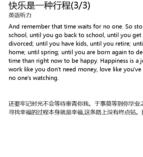 | hái yào láo jì shí guāng bú huì děng dài chuí qīng nǐ wǒ. yú shì mò děng dào nǐ bì yè zhī hòu chóng fǎn xiào yuán zhī shí zài qù děng dài xìng fú mò shēn xiàn wéi chéng zhī zhōng, lái lái wǎng wǎng, jìn jìn chū chū hòu cái qù děng dài xìng fú mò děng dào nǐ xī xià ráo zi mò děng dào nǐ lǎo lái guī yuán mò děng dào nǐ le zì jǐ de xīn chē mò děng dào nǐ qiáo qiān xīn jū mò děng dào zǎo chūn chí lái mò děng dào nǐ chóng huò xīn shēng hòu cái rèn shi dào rén shēng běn shì' mò dài lái rì, jí shí xíng lè' xún zhǎo xìng fú de guò chéng běn shēn jiù shì xìng fú, zhè tiáo lù shàng méi yǒu zhōng diǎn zhàn. nà me, nǐ jiù yào xiàng bù chóu xīn shuǐ nà bān qù gōng zuò chǎng kāi xīn fēi nà bān qù huān ài páng ruò wú rén nà bān qù gē wǔ. |