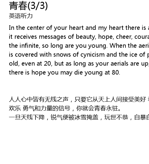 | 人人心中皆有无线之声,只要它从天上人间接受美好 希望 欢乐 勇气和力量的信号,你就会青春永驻。 一旦天线下降,锐气便被冰雪掩盖,玩世不恭,自暴自弃油然而生,即使年方二十,实已垂垂老矣;然则只要竖起天线,捕捉乐观信号,你就有望在八十高龄告别尘寰时仍觉青春伴随左右。 |
