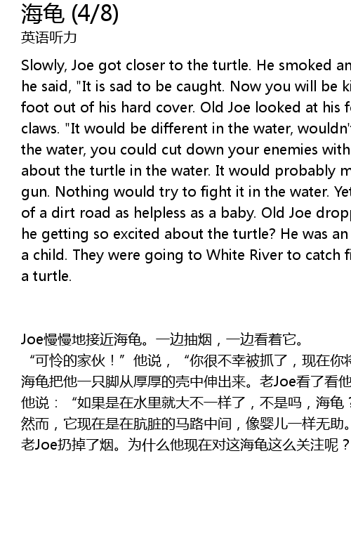 | Joe慢慢地接近海龟。一边抽烟,一边看着它。 “可怜的家伙!”他说,“你很不幸被抓了,现在你将会被杀死。” 海龟把他一只脚从厚厚的壳中伸出来。老Joe看了看他那带着锋利爪子的脚。 他说:“如果是在水里就大不一样了,不是吗,海龟?在水里的话,你讲用你锋利的爪子砍断你的敌人。”他相像海龟在水里的情景。它可能移动像从枪里打出的子弹一样快。没有什么能挑战他,在水中。 然而,它现在是在肮脏的马路中间,像婴儿一样无助。 老Joe扔掉了烟。为什么他现在对这海龟这么关注呢?他是一个老人,然而他的行为又像是一个孩子。他们打算去White河抓鱼,但他有担心起海龟来了。 |