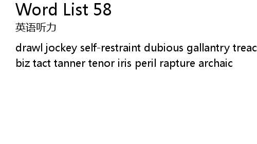 drawl jockey self-restraint dubious gallantry treacly epitaph dribble engender biz tact tanner tenor iris peril rapture archaic