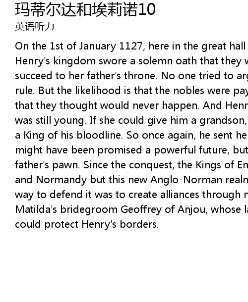 On the 1st of January 1127, here in the great hall at Westminster, the nobles of Henry's kingdom swore a solemn oath that they would support Matilda's right to succeed to her father's throne. No one tried to argue that a woman couldn't rule. But the likelihood is that the nobles were paying lip service to an idea that they thought would never happen. And Henry had an alternative plan. Matilda was still young. If she could give him a grandson, England might yet be ruled by a King of his bloodline. So once again, he sent her away to be married. She might have been promised a powerful future, but for the moment she was still her father's pawn. Since the conquest, the Kings of England had ruled both England and Normandy but this new Anglo-Norman realm was difficult to hold together. One way to defend it was to create alliances through marriage, so Henry chose as Matilda's bridegroom Geoffrey of Anjou, whose lands to the south of Normandy could protect Henry's borders. |