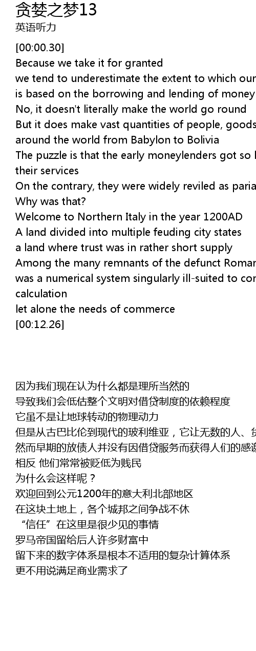 | [00:24.39] | The puzzle is that the early moneylenders got so little thanks for their services |