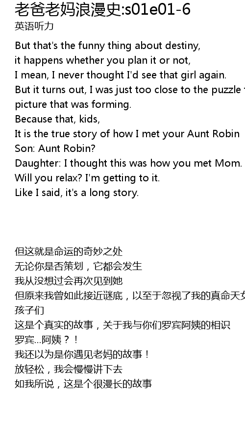 | [00:11.99] | It is the true story of how I met your Aunt Robin |