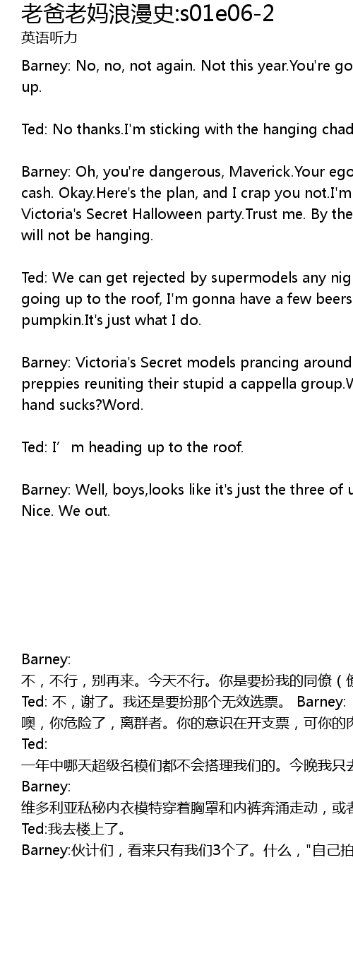 | Barney: 不,不行,别再来。今天不行。你是要扮我的同僚(僚机飞行员)。航空服,穿上! Ted: 不,谢了。我还是要扮那个无效选票。 Barney: 噢,你危险了,离群者。你的意识在开支票,可你的肉体却无法兑现。好了,我们这样,不和你废话了。我们去看万圣节维多利亚私秘晚会(内衣秀)。相信我,夜晚过后,你的选票肯定会兑现的。 Ted: 一年中哪天超级名模们都不会搭理我们的。今晚我只去楼顶,喝几杯啤酒,等候我的放荡南瓜。我只这么打算。 Barney: 维多利亚私秘内衣模特穿着胸罩和内裤奔涌走动,或者,耶鲁落榜生们聚在一起的笨蛋明星队。怎么说,左手?"右手逊透了",到点。 Ted:我去楼上了。 Barney:伙计们,看来只有我们3个了。什么,"自己拍",不错。我们走。 |