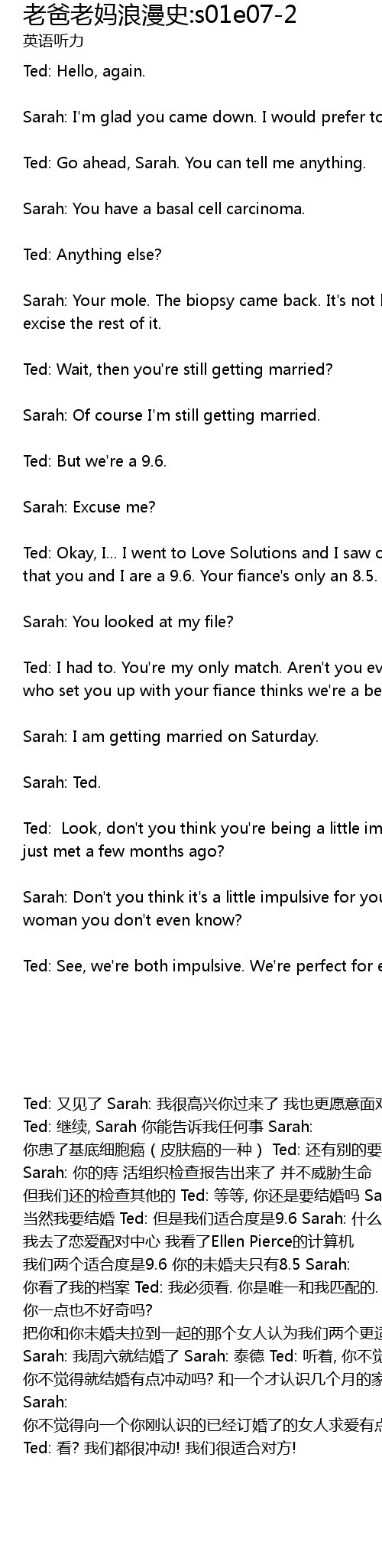 | Ted: 又见了 Sarah: 我很高兴你过来了 我也更愿意面对面跟你说 Ted: 继续, Sarah 你能告诉我任何事 Sarah: 你患了基底细胞癌(皮肤癌的一种) Ted: 还有别的要说吗 Sarah: 你的痔 活组织检查报告出来了 并不威胁生命 但我们还的检查其他的 Ted: 等等, 你还是要结婚吗 Sarah: 当然我要结婚 Ted: 但是我们适合度是9.6 Sarah: 什么 Ted: 好吧 我去了恋爱配对中心 我看了Ellen Pierce的计算机 我们两个适合度是9.6 你的未婚夫只有8.5 Sarah: 你看了我的档案 Ted: 我必须看. 你是唯一和我匹配的. 你一点也不好奇吗? 把你和你未婚夫拉到一起的那个女人认为我们两个更适合 Sarah: 我周六就结婚了 Sarah: 泰德 Ted: 听着, 你不觉得.. 你不觉得就结婚有点冲动吗? 和一个才认识几个月的家伙 Sarah: 你不觉得向一个你刚认识的已经订婚了的女人求爱有点冲动吗? Ted: 看? 我们都很冲动! 我们很适合对方! |