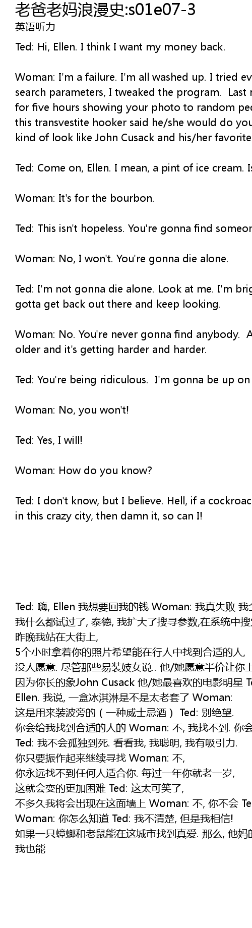 | Ted: hai, Ellen wo xiang yao hui wo de qian Woman: wo zhen shi bai wo quan gao za le. wo shen me du shi guo le, tai de, wo kuo da le sou xun can shu, zai xi tong zhong sou suo. zuo wan wo zhan zai da jie shang, 5 ge xiao shi na zhe ni de zhao pian xi wang neng zai hang ren zhong zhao dao he shi de ren, mei ren yuan yi. jin guan nei xie yi zhuang ji nv shuo.. ta ta yuan yi ban jia rang ni shang, yin wei ni zhang de xiang John Cusack ta ta zui xi huan de dian ying ming xing Ted: bie zhe yang, Ellen. wo shuo, yi he bing qi lin shi bu shi tai lao tao le Woman: zhe shi yong lai zhuang bo pang de yi zhong wei shi ji jiu Ted: bie jue wang. ni hui gei wo zhao dao he shi de ren de Woman: bu, wo zhao bu dao. ni hui gu du zhi si Ted: wo bu hui gu du dao si. kan kan wo, wo cong ming, wo you xi yin li. ni zhi yao zhen zuo qi lai ji xu xun zhao Woman: bu, ni yong yuan zhao bu dao ren he ren shi he ni. mei guo yi nian ni jiu lao yi sui, zhe jiu hui bian de geng jia kun nan Ted: zhe tai ke xiao le, bu duo jiu wo jiang hui chu xian zai zhe mian qiang shang Woman: bu, ni bu hui Ted: bu, wo hui Woman: ni zen me zhi dao Ted: wo bu qing chu, dan shi wo xiang xin! ru guo yi zhi zhang lang he lao shu neng zai zhe cheng shi zhao dao zhen ai. na me, ta ma de, wo ye neng |