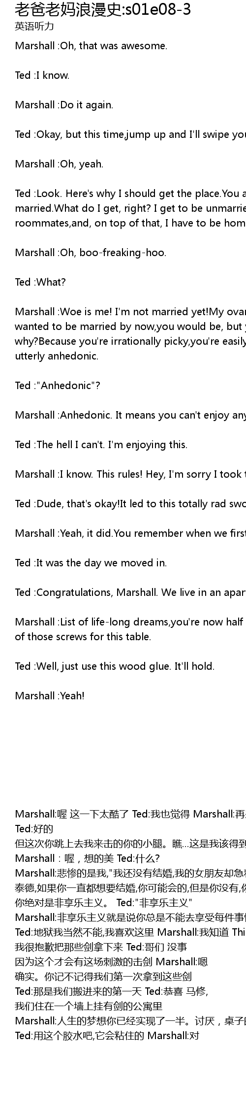 | Marshall:喔 这一下太酷了 Ted:我也觉得 Marshall:再来一遍 Ted:好的 但这次你跳上去我来击的你的小腿。瞧...这是我该得到这个地方的原因,你和莉莉,你将要结婚,而我得到了什么?嗯,我变成了单身汉,孤独寂寞,还失去了两个室友。更重要的是,我还变成无家可归,这难道公平吗? Marshall:喔,想的美 Ted:什么? Marshall:悲惨的是我,"我还没有结婚,我的女朋友却急着要孩子了" 泰德,如果你一直都想要结婚,你可能会的,但是你没有,你知道为什么吗,因为你太过于挑剔了,你很容易心烦意乱 你绝对是非享乐主义。 Ted:"非享乐主义" Marshall:非享乐主义就是说你总是不能去享受每件事情 Ted:地狱我当然不能,我喜欢这里 Marshall:我知道 This rules嗨 我很抱歉把那些剑拿下来 Ted:哥们 没事 因为这个才会有这场刺激的击剑 Marshall:嗯 确实。你记不记得我们第一次拿到这些剑 Ted:那是我们搬进来的第一天 Ted:恭喜 马修, 我们住在一个墙上挂有剑的公寓里 Marshall:人生的梦想你已经实现了一半。讨厌,桌子的螺丝找不到了 Ted:用这个胶水吧,它会粘住的 Marshall:对 |