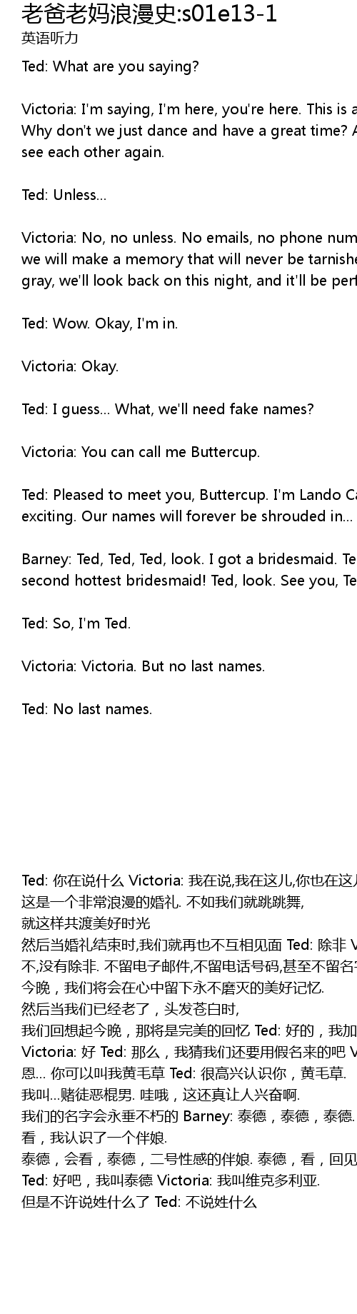 | Ted: 你在说什么 Victoria: 我在说,我在这儿,你也在这儿. 这是一个非常浪漫的婚礼. 不如我们就跳跳舞, 就这样共渡美好时光 然后当婚礼结束时,我们就再也不互相见面 Ted: 除非 Victoria: 不,没有除非. 不留电子邮件,不留电话号码,甚至不留名字. 今晚,我们将会在心中留下永不磨灭的美好记忆. 然后当我们已经老了,头发苍白时, 我们回想起今晚,那将是完美的回忆 Ted: 好的,我加入 Victoria: 好 Ted: 那么,我猜我们还要用假名来的吧 Victoria: 恩... 你可以叫我黄毛草 Ted: 很高兴认识你,黄毛草. 我叫...赌徒恶棍男. 哇哦,这还真让人兴奋啊. 我们的名字会永垂不朽的 Barney: 泰德,泰德,泰德. 看,我认识了一个伴娘. 泰德,会看,泰德,二号性感的伴娘. 泰德,看,回见,泰德 Ted: 好吧,我叫泰德 Victoria: 我叫维克多利亚. 但是不许说姓什么了 Ted: 不说姓什么 |
