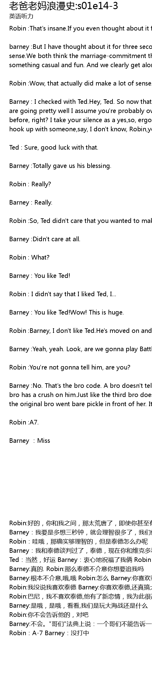 | Robin: hao de, ni he wo zhi jian, na tai huang tang le, ji shi ni shen zhi you na me yi miao zhong you zhe zhong xiang fa Barney: wo yao shi duo xiang san miao zhong, jiu hui li zhi hen duo le, wo men lia dou hui xiang hun yin yi wu shi wu liao de shi qing, wo men lia dou hui xiang yao xie xian xia he le qu, na me wo men jiu hen xiang chu de hen rong qia Robin: wa o, na que shi gou li zhi de, dan shi tai de zen me ban ne Barney: wo he tai de tan pan guo le, tai de, xian zai ni he wei ke duo li ya zhi jian jin zhan bu cuo, wo gu ji ni dui yi qian suo you de nv hai dou jue yuan le, shi ma? wo jiu ba ni de chen mo dang zuo mo ren le, na me wo jiu qu pao mou ren lou, bi ru shuo robin, ni bu hui bu shuang de, dui ba? Ted: dang ran, hao yun Barney: zhong xin di zhu fu le wo lia Robin: zhen de? Barney: zhen de. Robin: na me tai de bu jie yi ni xiang yao zhui wo ma Barney: gen ben bu jie yi, o, o Robin: zen me Barney: ni xi huan tai de Robin: wo mei shuo wo xi huan tai de Barney: ni xi huan tai de, hai zhen gao da le Robin: ba ni, wo bu xi huan tai de, ta you le xin lian qing, wo wei ci hen gao xing Barney: shi o, shi o, kan kan, wo men shi wan da hai zhan hai shi shen me Robin: ni bu hui gao su ta de, dui ba Barney: bu hui." ge men" fa dian shang shuo: yi ge ge men bu neng gao su yi ge gong tong de ge men you ling wai yi ge ge men xi huan ta, jiu hao xiang ling yi ge ge men bu hui gao su na ge gong tong de ge men kai shi de na ge ge men zai ta mian qian chu guo chou yi yang, zhe shi ge men ping deng yuan ze Robin: A7 Barney: mei da zhong |