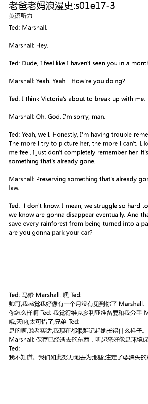 | Ted: mǎ xiū Marshall: hēi Ted: shuài gē, wǒ gǎn jué wǒ hǎo xiàng yǒu yí gè yuè méi yǒu jiàn dào nǐ le Marshall: nǐ zěn me yàng a Ted: wǒ jué de wéi kè duō lì yà zhǔn bèi yào hé wǒ fēn shǒu Marshall: ó, tiān nà, tài kě xī le, xiōng dì Ted: shì de a, shuō lǎo shí huà, wǒ xiàn zài dōu hěn nán jì qǐ tā zhǎng de shén me yàng zi. wǒ yuè shì qù xiǎng tā shì shén me yàng zi, jiù yuè shì xiǎng bù chū lái. bǐ rú, wǒ jì de tā gěi wǒ de gǎn jué, wǒ jiù shì, wǒ jiù shì méi fǎ wán quán xiǎng qǐ tā de yàng zi, jiù xiàng wǒ xiǎng yào bǎo cún nà yǐ jīng shì qù de dōng xī. Marshall: bǎo cún yǐ jīng shì qù de dōng xī, tīng qǐ lái hǎo xiàng shì huán jìng bǎo hù fǎ. Ted: wǒ bù zhī dào. wǒ men rú cǐ nǔ lì dì qù wèi nèi xiē, zhù dìng le yào xiāo shī de dōng xī ér fèn dòu. zhè hěn gāo shàng a. dàn jí shǐ nǐ wǎn jiù xià le měi yī piàn yào bèi gǎi zào chéng tíng chē chǎng de yǔ lín, nà me nǐ yòu zhǔn bèi bǎ chē tíng dào nǎ lǐ qù ne? |