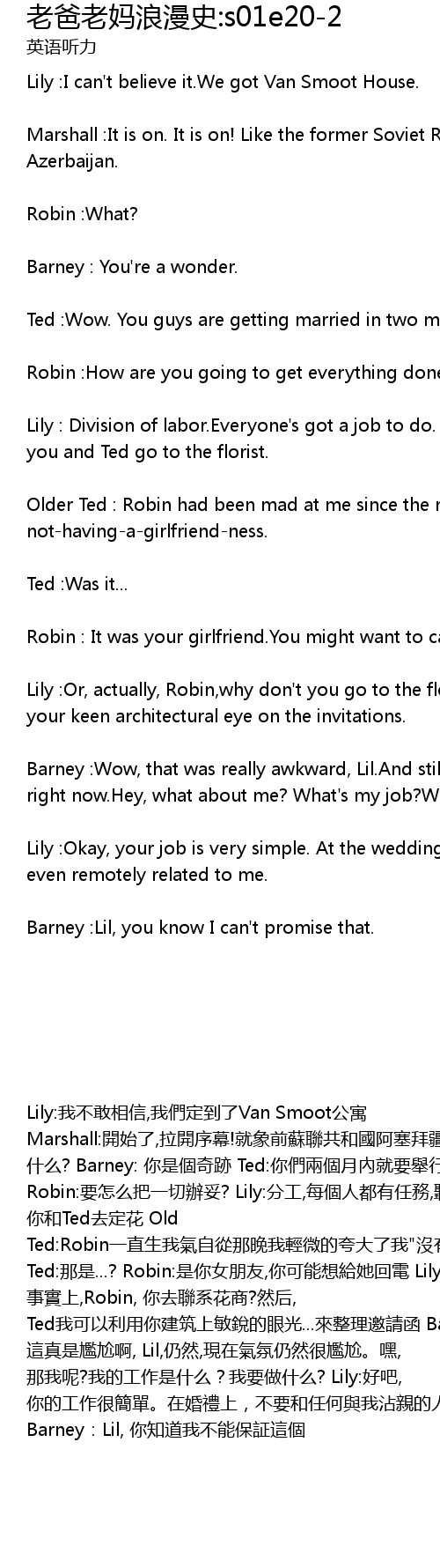 | Lily: wo bu gan xiang xin, wo men ding dao le Van Smoot gong yu Marshall: kai shi le, la kai xu mu! jiu xiang qian su lian gong he guo a sai bai jiang Robin: shen me? Barney: ni shi ge qi ji Ted: ni men liang ge yue nei jiu yao ju xing hun li le Robin: yao zen me ba yi qie ban tuo? Lily: fen gong, mei ge ren dou you ren wu, ting hao, Robin, ni he Ted qu ding hua Old Ted: Robin yi zhi sheng wo qi zi cong na wan wo qing wei de kua da le wo" mei you nv peng you" Ted: na shi...? Robin: shi ni nv peng you, ni ke neng xiang gei ta hui dian Lily: huo zhe, shi shi shang, Robin, ni qu lian xi hua shang? ran hou, Ted wo ke yi li yong ni jian zhu shang min rui de yan guang... lai zheng li yao qing han Barney: wa, zhe zhen shi gan ga a, Lil, reng ran, xian zai qi fen reng ran hen gan ga. hei, na wo ne? wo de gong zuo shi shen me? wo yao zuo shi mo? Lily: hao ba, ni de gong zuo hen jian dan. zai hun li shang, bu yao he ren he yu wo zhan qin de ren shui jue Barney: Lil, ni zhi dao wo bu neng bao zheng zhe ge |
