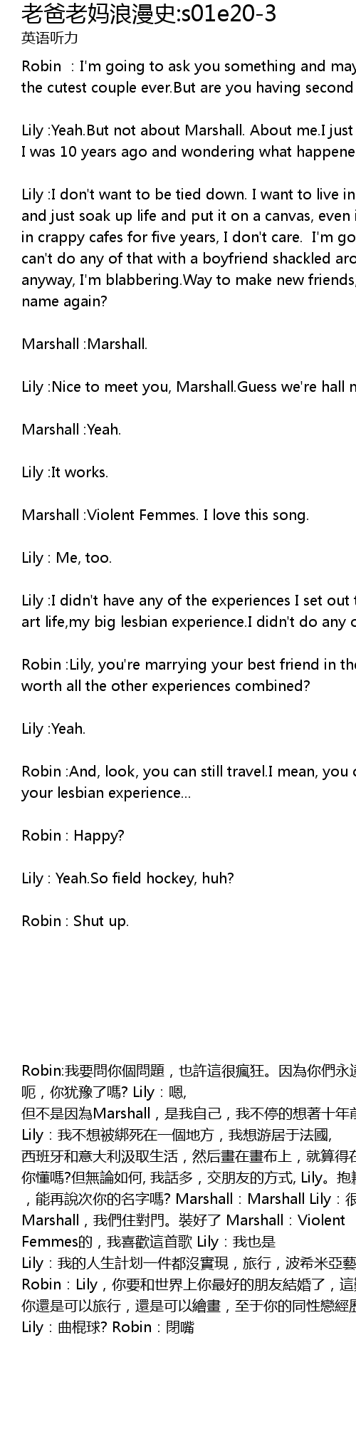 | Robin: wo yao wen ni ge wen ti, ye xu zhe hen feng kuang. yin wei ni men yong yuan shi zui ke ai de yi dui. dan, e, ni you yu le ma? Lily: , dan bu shi yin wei Marshall, shi wo zi ji, wo bu ting de xiang zhe shi nian qian de zi ji, xiang zhe ta jing li le shen me Lily: wo bu xiang bei bang si zai yi ge di fang, wo xiang you ju yu fa guo, xi ban ya he yi da li ji qu sheng huo, ran hou hua zai hua bu shang, jiu suan de zai lan ka fei guan li duan shang wu nian pan zi, wo ye bu zai hu, wo yao dang ge hua jia. pang bian you ge nan peng you qian zhe wo bo zi, wo jiu zuo bu liao zhe xie le, ni dong ma? dan wu lun ru he, wo hua duo, jiao peng you de fang shi, Lily. bao qian , neng zai shuo ci ni de ming zi ma? Marshall: Marshall Lily: hen gao xing ren shi ni, Marshall, wo men zhu dui men. zhuang hao le Marshall: Violent Femmes de, wo xi huan zhe shou ge Lily: wo ye shi Lily: wo de ren sheng ji hua yi jian dou mei shi xian, lv xing, bo xi mi ya yi shu sheng huo, wo de sheng da tong xing lian jing li, wo shen me ye mei zuo Robin: Lily, ni yao he shi jie shang ni zui hao de peng you jie hun le, zhe nan dao bu zhi de yong suo you zhe xie jing li huan qu ma? hai you, ni hai shi ke yi lv xing, hai shi ke yi hui hua, zhi yu ni de tong xing lian jing li... kai xin le ba? Lily: qu gun qiu? Robin: bi zui |