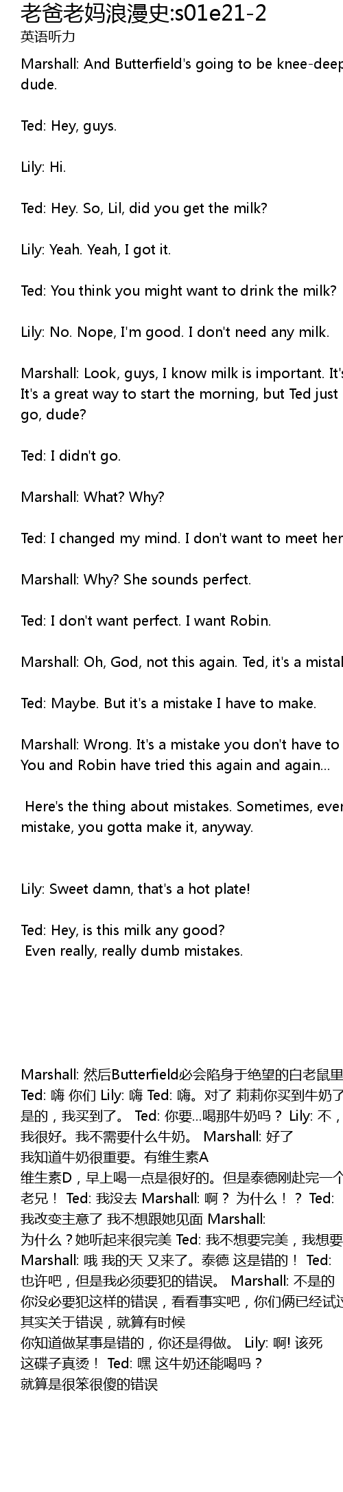 | Marshall: rán hòu Butterfield bì huì xiàn shēn yú jué wàng de bái lǎo shǔ lǐ.. hāi xiōng dì. Ted: hāi nǐ men Lily: hāi Ted: hāi. duì le lì lì nǐ mǎi dào niú nǎi le ma? Lily: shì de, wǒ mǎi dào le. Ted: nǐ yào... hē nà niú nǎi ma? Lily: bù, bù wǒ hěn hǎo. wǒ bù xū yào shén me niú nǎi. Marshall: hǎo le wǒ zhī dào niú nǎi hěn zhòng yào. yǒu wéi shēng sù A wéi shēng sù D, zǎo shàng hē yì diǎn shì hěn hǎo de. dàn shì tài dé gāng fù wán yí gè zhòng yào de yuē huì. zěn me yàng lǎo xiōng! Ted: wǒ méi qù Marshall: a? wèi shí me!? Ted: wǒ gǎi biàn zhǔ yì le wǒ bù xiǎng gēn tā jiàn miàn Marshall: wèi shí me? tā tīng qǐ lái hěn wán měi Ted: wǒ bù xiǎng yào wán měi, wǒ xiǎng yào luó bīn. Marshall: ó wǒ de tiān yòu lái le. tài dé zhè shì cuò de! Ted: yě xǔ ba, dàn shì wǒ bì xū yào fàn de cuò wù. Marshall: bú shì de nǐ méi bì yào fàn zhè yàng de cuò wù, kàn kàn shì shí ba, nǐ men liǎ yǐ jīng shì guò wú shù cì le... qí shí guān yú cuò wù, jiù suàn yǒu shí hou nǐ zhī dào zuò mǒu shì shì cuò de, nǐ hái shì de zuò. Lily: a! gāi sǐ zhè dié zǐ zhēn tàng! Ted: hēi zhè niú nǎi hái néng hē ma? jiù suàn shì hěn bèn hěn shǎ de cuò wù |