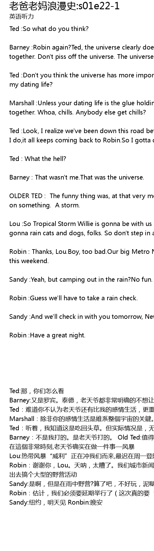 | Ted: na, ni men zen me kan Barney: you shi luo bin. tai de, lao tian ye dou fei chang ming que de bu xiang rang ni he luo bin zai yi qi de. bie ba lao tian ye re mao le, lao tian ye hui guo lai da ni yi ba zhang de. Ted: nan dao ni bu ren wei lao tian ye hai you bi wo de gan qing sheng huo, geng zhong yao de shi qing yao qu kao lv ma? Marshall: chu fei ni de gan qing sheng huo shi wei xi zheng ge yu zhou de guan jian. wa o, hao leng, ni men bu jue de leng ma Ted: ting zhe, wo zhi dao zhe shi chi hui tou cao. dan shi ji qing kuang shi, wu lun wo zen me zuo, dou hui xiang qi luo bin. suo yi, wo zhun bei jiu zhe me zuo le. wa o! gao shen me? Barney: bu shi wo da de. shi lao tian ye da de. Old Ted: zhi de yi ti de shi, zai zhe ge fei chang shi ke, lao tian ye que shi zai zuo yi jian shi feng bao Lou: re dai feng bao" wei li" zheng zai chong wo men er lai, zui chi zai zhou yi deng lu. tong zhi men, tian yao xia qing pen da yu le jie shi jiang you yi chang man tian mao gou de da yu suo yi mei shi bu yao chu men tang hun shui suo yi xiao xin bie cai dao gou gou. shan di? luo bin? Robin: xie xie ni, Lou. tian na, tai zao le. wo men cheng shi xin wen yi pin dao ben da suan zhe zhou mo chu qu gao ge da xing de ye ying huo dong Sandy: shi a, dan shi zai yu zhong ye ying? suan le ba, bu hao wan, ni hu hu de, hen tao yan, zhen e xin. Robin: gu ji, wo men bi xu yao yan qi ju xing le zhe ci zhen de yao" yin yu tui chi" le Sandy: niu yue, ming tian jian Ronbin: wan an |