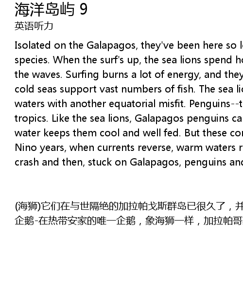 | (海狮)它们在与世隔绝的加拉帕戈斯群岛已很久了,并成了一个独立的物种。在拍岸浪花上,海狮花数小时在浪中嬉戏,拍岸浪有着很大的力量。但它们只能这么做,因为寒冷的海洋供养着无数的鱼类,分享这些富含养分海水的,是海狮和其它不适合在赤道生存的动物 企鹅-在热带安家的唯一企鹅,象海狮一样,加拉帕哥斯企鹅幸存于此依赖的是海水的低温和优质的食物。但这样的环境并不是一成不变的,在厄尔尼诺发生年份,洋流逆转暖水代替了冷水,鱼群数量锐减,受困于加拉帕戈斯的企鹅和海狮只有挨饿。 |