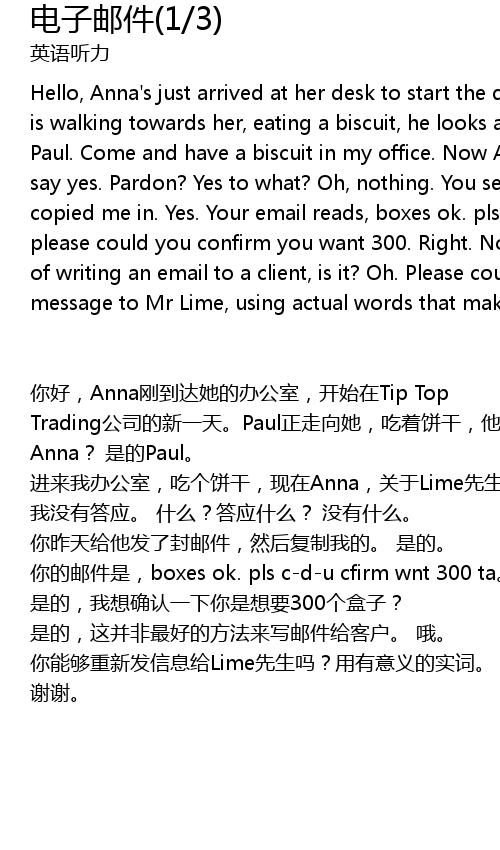 | Hello, Anna' s just arrived at her desk to start the day at Tip Top Trading. Paul is walking towards her, eating a biscuit, he looks a bit bothered. Anna? Yes, Paul. Come and have a biscuit in my office. Now Anna, about Mr Lime. I didn' t say yes. Pardon? Yes to what? Oh, nothing. You sent him an email yesterday and copied me in. Yes. Your email reads, boxes ok. pls cdu cfirm wnt 300 ta. Yes, please could you confirm you want 300. Right. Now that' s not really the best way of writing an email to a client, is it? Oh. Please could you resend your message to Mr Lime, using actual words that make sense. Okay. Thank you. | |