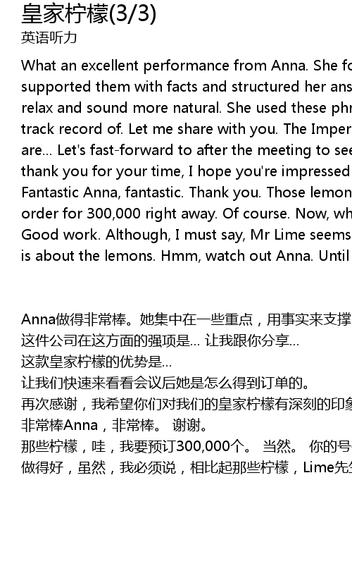 | Anna做得非常棒。她集中在一些重点,用事实来支撑它们,使她答案非常清晰有条理。她尝试放松和听起来更自然。她用这些短语。 这件公司在这方面的强项是... 让我跟你分享... 这款皇家柠檬的优势是... 让我们快速来看看会议后她是怎么得到订单的。 再次感谢,我希望你们对我们的皇家柠檬有深刻的印象。 非常棒Anna,非常棒。 谢谢。 那些柠檬,哇,我要预订300,000个。 当然。 你的号码是? 做得好,虽然,我必须说,相比起那些柠檬,Lime先生似乎对Anna更有兴趣。Anna要小心的,我们下次再见。 |
