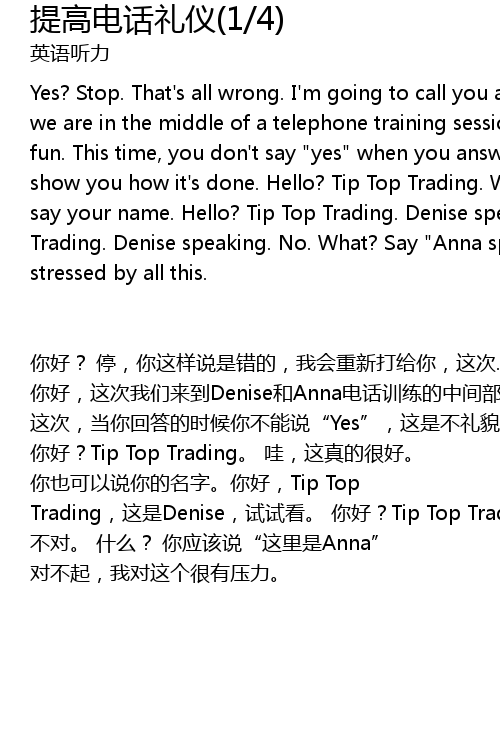 | ni hao? ting, ni zhe yang shuo shi cuo de, wo hui chong xin da gei ni, zhe ci...... ni hao, zhe ci wo men lai dao Denise he Anna dian hua xun lian de zhong jian bu fen, zhe zhen de tai you qu le. zhe ci, dang ni hui da de shi hou ni bu neng shuo" Yes", zhe shi bu li mao de. da dian hua gei wo, wo hui zuo gei ni kan ni ying gai zen me shuo. ni hao? Tip Top Trading. wa, zhe zhen de hen hao. ni ye ke yi shuo ni de ming zi. ni hao, Tip Top Trading, zhe shi Denise, shi shi kan. ni hao? Tip Top Trading, zhe shi Denise. bu dui. shen me? ni ying gai shuo" zhe li shi Anna" dui bu qi, wo dui zhe ge hen you ya li. |