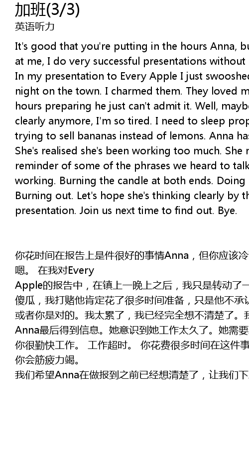 | It' s good that you' re putting in the hours Anna, but you should calm down. Look at me, I do very successful presentations without spending hours preparing. Ha. In my presentation to Every Apple I just swooshed in with no preparation after a night on the town. I charmed them. They loved me. Idiot. I bet he actually spent hours preparing he just can' t admit it. Well, maybe you' re right. I can' t think clearly anymore, I' m so tired. I need to sleep properly otherwise I' ll end up trying to sell bananas instead of lemons. Anna has finally got the message. She' s realised she' s been working too much. She needs to be realistic. Here' s a reminder of some of the phrases we heard to talk about how much Anna had been working. Burning the candle at both ends. Doing overtime. Putting in the hours. Burning out. Let' s hope she' s thinking clearly by the time she has to do her presentation. Join us next time to find out. Bye. | |