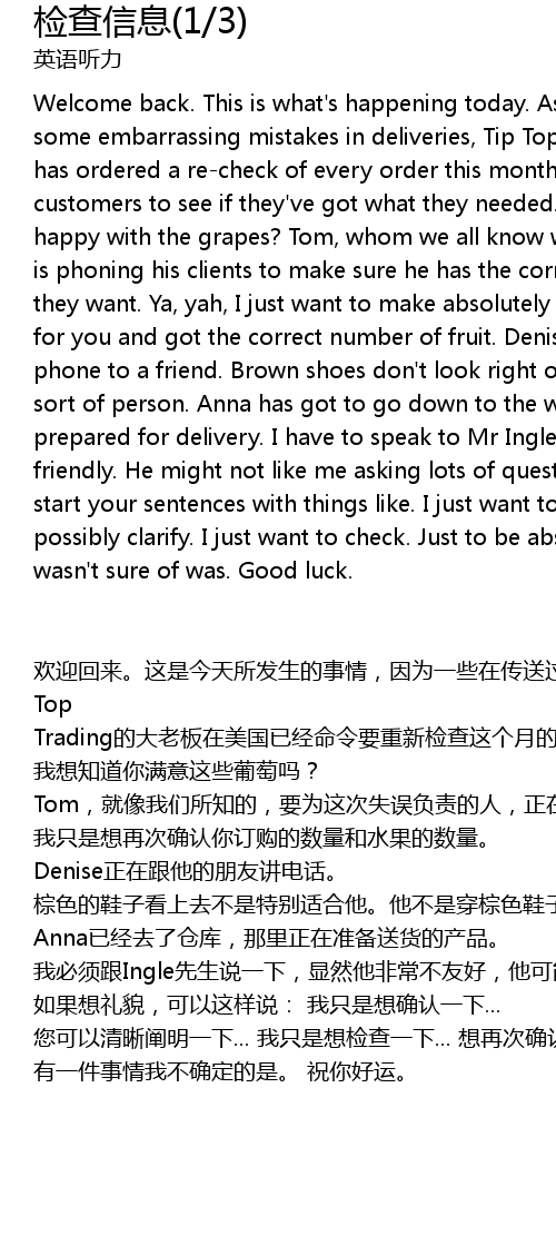 | 欢迎回来。这是今天所发生的事情,因为一些在传送过程中尴尬的错误。Tip Top Trading的大老板在美国已经命令要重新检查这个月的每份订单。所以,Paul现在正在跟主要的顾客谈话,看看他们是否得到了他们想要的商品。 我想知道你满意这些葡萄吗? Tom,就像我们所知的,要为这次失误负责的人,正在打电话给他的客户打电话确认他们订购的正确信息。 我只是想再次确认你订购的数量和水果的数量。 Denise正在跟他的朋友讲电话。 棕色的鞋子看上去不是特别适合他。他不是穿棕色鞋子的人。 Anna已经去了仓库,那里正在准备送货的产品。 我必须跟Ingle先生说一下,显然他非常不友好,他可能不喜欢我问那么多问题。 如果想礼貌,可以这样说: 我只是想确认一下... 您可以清晰阐明一下... 我只是想检查一下... 想再次确认... 有一件事情我不确定的是。 祝你好运。 |