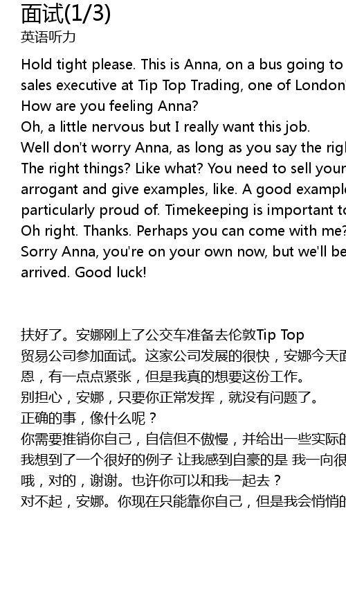 | 扶好了。安娜刚上了公交车准备去伦敦Tip Top 贸易公司参加面试。这家公司发展的很快,安娜今天面试的职位是销售专员。感觉怎么样,安娜? 恩,有一点点紧张,但是我真的想要这份工作。 别担心,安娜,只要你正常发挥,就没有问题了。 正确的事,像什么呢? 你需要推销你自己,自信但不傲慢,并给出一些实际的例子,像 我想到了一个很好的例子 让我感到自豪的是 我一向很守时。 哦,对的,谢谢。也许你可以和我一起去? 对不起,安娜。你现在只能靠你自己,但是我会悄悄的替你鼓劲。看,你快到了,祝你好运。 |