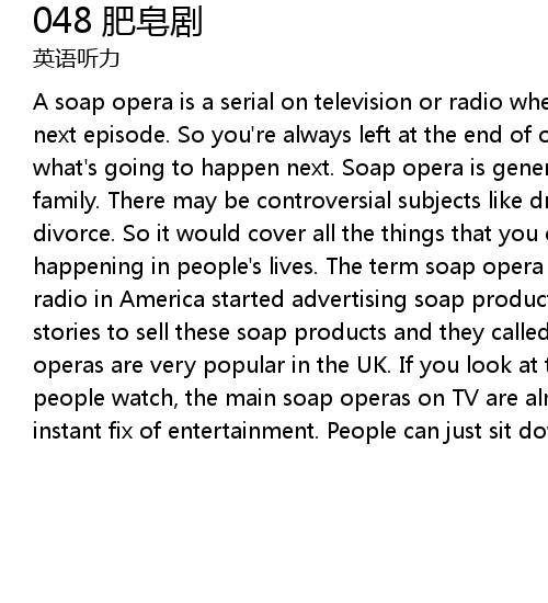 | A soap opera is a serial on television or radio where each episode links to the next episode. So you're always left at the end of one short episode wondering what's going to happen next. Soap opera is generally about neighbours, friends, family. There may be controversial subjects like drug taking, or violence, divorce. So it would cover all the things that you could imagine possibly happening in people's lives. The term soap opera comes from the 1950s, when radio in America started advertising soap products and they devised little stories to sell these soap products and they called them soap operas. Soap operas are very popular in the UK. If you look at the most popular programmes people watch, the main soap operas on TV are almost always at the top. It's an instant fix of entertainment. People can just sit down on the sofa and enjoy it. |