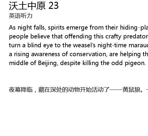 | 夜幕降临,藏在深处的动物开始活动了——黄鼠狼。一些人认为冒犯这些狡猾的肉食动物会带来坏运气,所以对黄鼠狼晚上的活动,人们睁一只眼闭一只眼。旧的观念连同逐渐增强的保护意识,使得黄鼠狼能在北京城生存,尽管人们还在猎杀残存的鸽子。 |