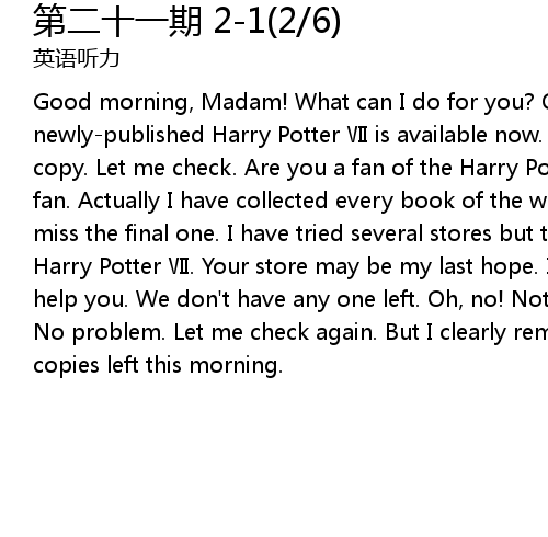 | Good morning, Madam! What can I do for you? Oh, yes. I was just told that the newly-published Harry Potter Ⅶ is available now. So I can't wait to have one copy. Let me check. Are you a fan of the Harry Potter series? Yes, I'm a huge fan. Actually I have collected every book of the whole series. Of course I can't miss the final one. I have tried several stores but they have all sold out the Harry Potter Ⅶ. Your store may be my last hope. I am terribly sorry. I can't help you. We don't have any one left. Oh, no! Not again! Could you check again? No problem. Let me check again. But I clearly remember that there were several copies left this morning. |