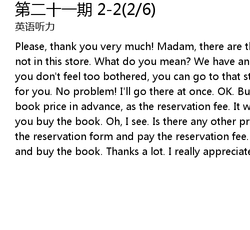 | Please, thank you very much! Madam, there are three copies left, but they are not in this store. What do you mean? We have another store two blocks away. If you don't feel too bothered, you can go to that store. We can reserve one copy for you. No problem! I'll go there at once. OK. But you have to pay 15% of the book price in advance, as the reservation fee. It will be paid back to you when you buy the book. Oh, I see. Is there any other procedure? Yes, please fill in the reservation form and pay the reservation fee. And you can go to that store and buy the book. Thanks a lot. I really appreciate your help. |