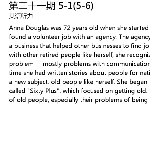 | Anna Douglas was 72 years old when she started writing her newspaper column. She found a volunteer job with an agency. The agency that she chose to work for was a business that helped other businesses to find jobs for old people. By talking with other retired people like herself, she recognized that old people had one problem -- mostly problems with communication. Through the years, from time to time she had written stories about people for national magazines. Now there was a new subject: old people like herself. She began to write a newspaper column called "Sixty Plus", which focused on getting old. She writes about the problems of old people, especially their problems of being misunderstood. |