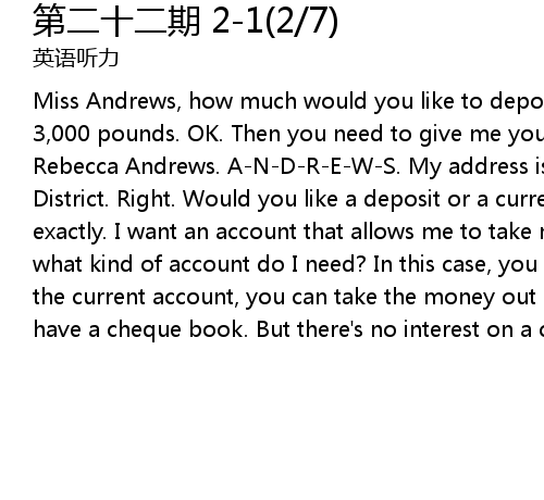 | Miss Andrews, how much would you like to deposit in your new account? Well, 3,000 pounds. OK. Then you need to give me your full name and address. OK. Rebecca Andrews. A-N-D-R-E-W-S. My address is 25 Eastlake, Redford Road, Sunset District. Right. Would you like a deposit or a current account? I don't know exactly. I want an account that allows me to take my money out at any time, so what kind of account do I need? In this case, you need a current account. With the current account, you can take the money out anytime and in addition, you can have a cheque book. But there's no interest on a current account. |