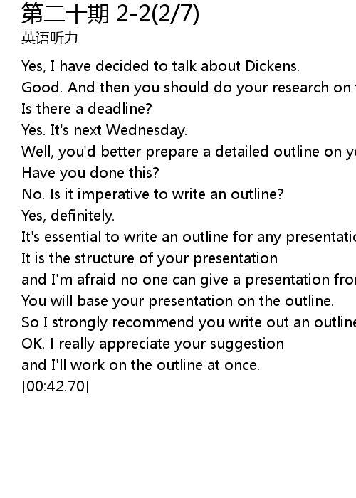 | [00:19.70] | It's essential to write an outline for any presentation. |
