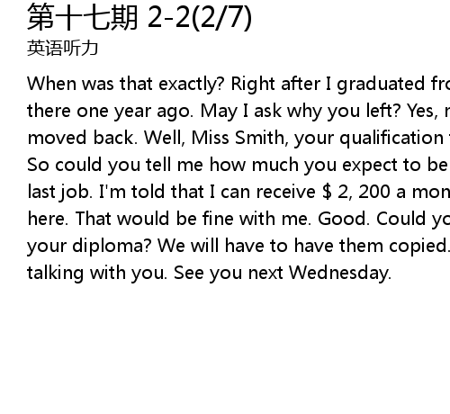 | When was that exactly? Right after I graduated from college and before I left there one year ago. May I ask why you left? Yes, my family lives here, so I moved back. Well, Miss Smith, your qualification for the position is excellent. So could you tell me how much you expect to be paid? I got $2, 000 a month in my last job. I'm told that I can receive $ 2, 200 a month as a starting salary here. That would be fine with me. Good. Could you come here next Wednesday with your diploma? We will have to have them copied. Yes, of course. It has been nice talking with you. See you next Wednesday. |