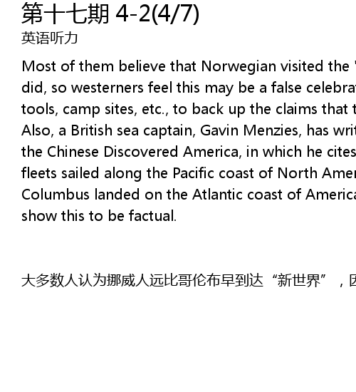 | 大多数人认为挪威人远比哥伦布早到达“新世界”,因此西方人觉得也许他们一直在错误的庆祝。专家已经找到了工具和野营遗址等等,来支持挪威人是最先到达美洲的这一声明。同样,一个英国海航家,写了一本书,在1421年中国人发现了美洲,在书中他引用了中国舰队先于哥伦布登陆美洲大概70年沿着北美洲航行的证据。中国人的航海地图证明了这个是真实的。 |