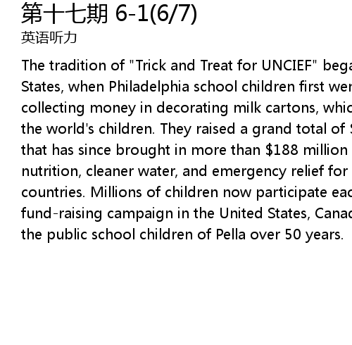 | The tradition of "Trick and Treat for UNCIEF" began in 1950 in the United States, when Philadelphia school children first went door to door at Halloween collecting money in decorating milk cartons, which would be sold later to help the world's children. They raised a grand total of $ 17, kicking off a campaign that has since brought in more than $188 million to provide medicine, better nutrition, cleaner water, and emergency relief for children in more than 160 countries. Millions of children now participate each year in Halloween-related fund-raising campaign in the United States, Canada and Mexico. This has included the public school children of Pella over 50 years. |