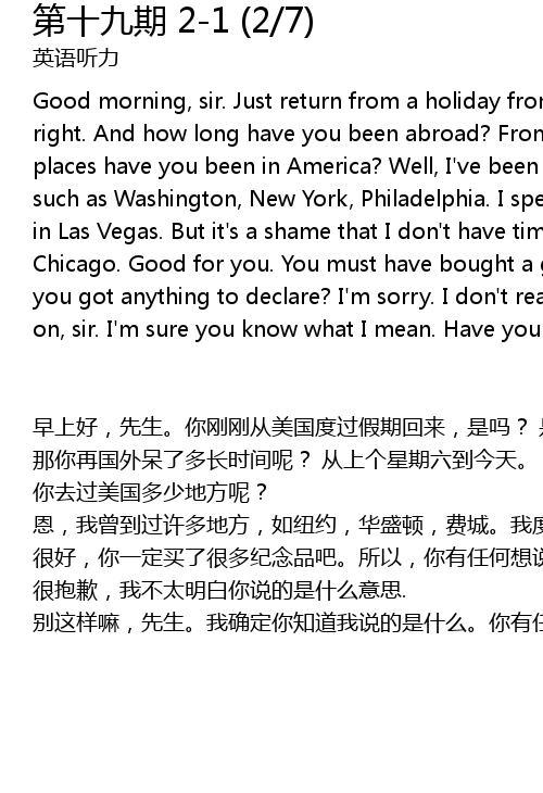 | zǎo shàng hǎo, xiān shēng. nǐ gāng gāng cóng měi guó dù guò jià qī huí lái, shì ma? shì de. nà nǐ zài guó wài dāi le duō zhǎng shí jiān ne? cóng shàng ge xīng qī liù dào jīn tiān. nǐ qù guò měi guó duō shǎo dì fāng ne? ēn, wǒ céng dào guò xǔ duō dì fāng, rú niǔ yuē, huá shèng dùn, fèi chéng. wǒ dù guò le zuì měi hǎo de yì tiān zài lā sī wéi jiā sī. dàn yí hàn de shì wǒ méi yǒu shí jiān qù luò shān jī hé zhī jiā gē. hěn hǎo, nǐ yí dìng mǎi le hěn duō jì niàn pǐn ba. suǒ yǐ, nǐ yǒu rèn hé xiǎng shuō míng de ma? hěn bào qiàn, wǒ bù tài míng bái nǐ shuō de shì shén me yì sī. bié zhè yàng ma, xiān shēng. wǒ què dìng nǐ zhī dào wǒ shuō de shì shén me. nǐ yǒu rèn hé xiǎng shuō míng de ma? |