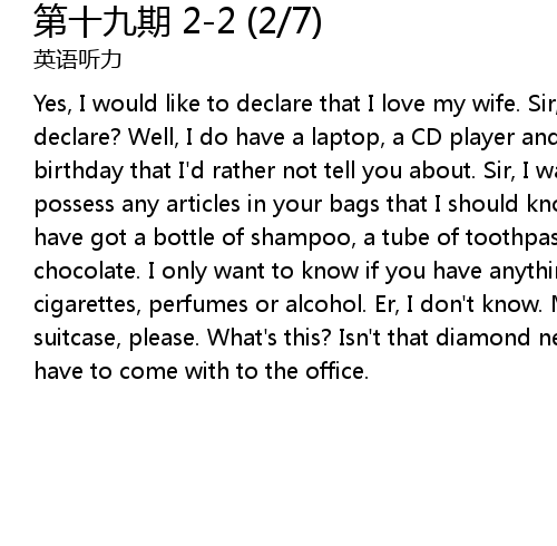 | Yes, I would like to declare that I love my wife. Sir, do you have any goods to declare? Well, I do have a laptop, a CD player and a present for my wife's birthday that I'd rather not tell you about. Sir, I want to know whether you possess any articles in your bags that I should know about. Let me see. Well, I have got a bottle of shampoo, a tube of toothpaste, clothes and some bars of chocolate. I only want to know if you have anything liable for tax, like cigarettes, perfumes or alcohol. Er, I don't know. Maybe not. Open your suitcase, please. What's this? Isn't that diamond necklace? OK, I'm afraid you have to come with to the office. |